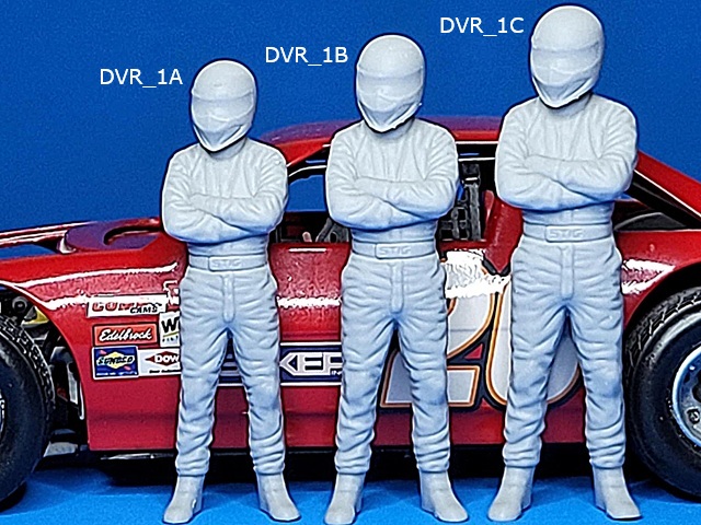 The DVR_1C is a great addition to any build. This high detail driver figure measures 72.0 mm tall and stands with no assistance. Shown against 1/25 scale NASCAR kit and other figures for size comparison. Part number is for 2 figures of the same part number, no mix and matching.